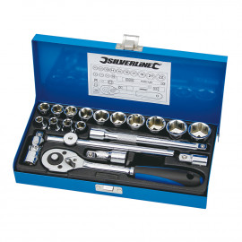 Polished chrome vanadium steel. Quick-release ratchet handle with dual density grip. Includes universal joint and 1/2" – 3/8” adaptor, 2 x extension bars (50 and 150mm) and sliding T-bar. Socket sizes: 6, 7, 8, 10, 11, 12, 13, 14, 15, 16, 17, 19, 21 and 22mm...