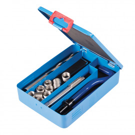 Includes everything to repair female thread in steel, cast iron and aluminium. Sprung insert coils create a stronger thread than the original metal. Kit includes HSS tap, twist drill, coil driver, tang remover, spare inserts and hex key...
