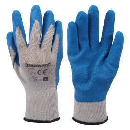 Heavy duty construction for general usage. 10-gauge polycotton shell and latex-dipped palm. Abrasion and puncture resistant. Supported glove, anatomical design, crinkle finish and knitted wrist. Intermediate design...