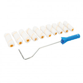 Mini Roller Frame & 10 SleevesZinc-faced mini metal frame with durable plastic handle. Includes 10 acrylic rollers for use on smooth or textured surfaces for use with emulsions and quick drying water based or acrylic based paints. Handle length is 400mm, great for getting into hard to reach places and also no need to remove radiators as this wi..