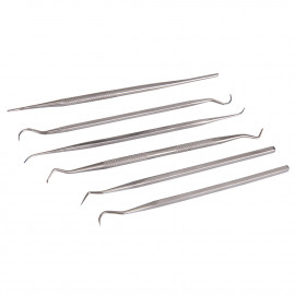 Stainless steel set of picks and probes ideal for carving and sculpturing. Includes 3 single-end picks and 3 double-end hooks...