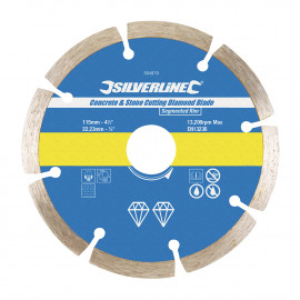 Blade with 7mm segment height for fast cutting and long life. Excellent cutting speed and blade life balance. For general building use on stone, concrete, pipes, brick, roof tiles, patio slabs and lintels. Max 10,100rpm. Compatible with 22.23mm bore angle grinders including Silverline and GMC. Wet or dry use...