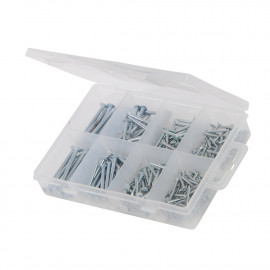 Zinc-plated for corrosion resistance. PZD countersunk head self-tapping screws. Includes assorted metric sizes: 3 x 12, 3.5 x 16, 3.5 x 19, 4 x 16, 4 x 19, 4 x 25, 4 x 30 and 5 x 30mm. Handy storage case with compartments...
