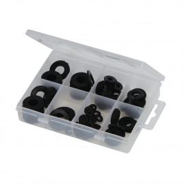 Open rubber grommets used for anti-vibration purposes and industrial applications. Prevents chafing when passing cables and pipes through metal panels. Includes assorted sizes 2.5 x 10.5 x 6.5 to 16 x 29 x 7.5mm. Handy storage case with compartments...