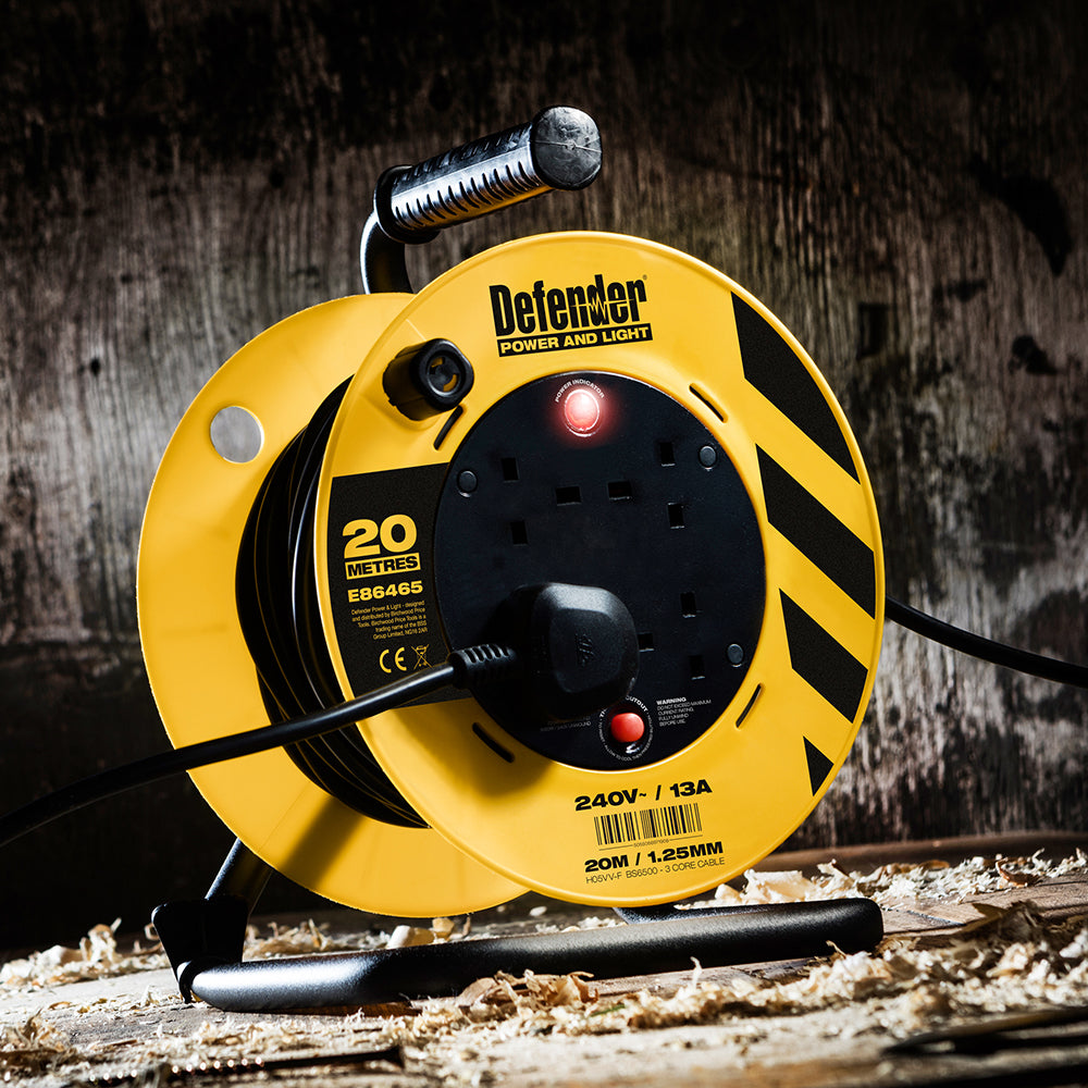 Defender 240 Volt Cable Reel Extension Lead 4 Gang Sockets 20m. E86465